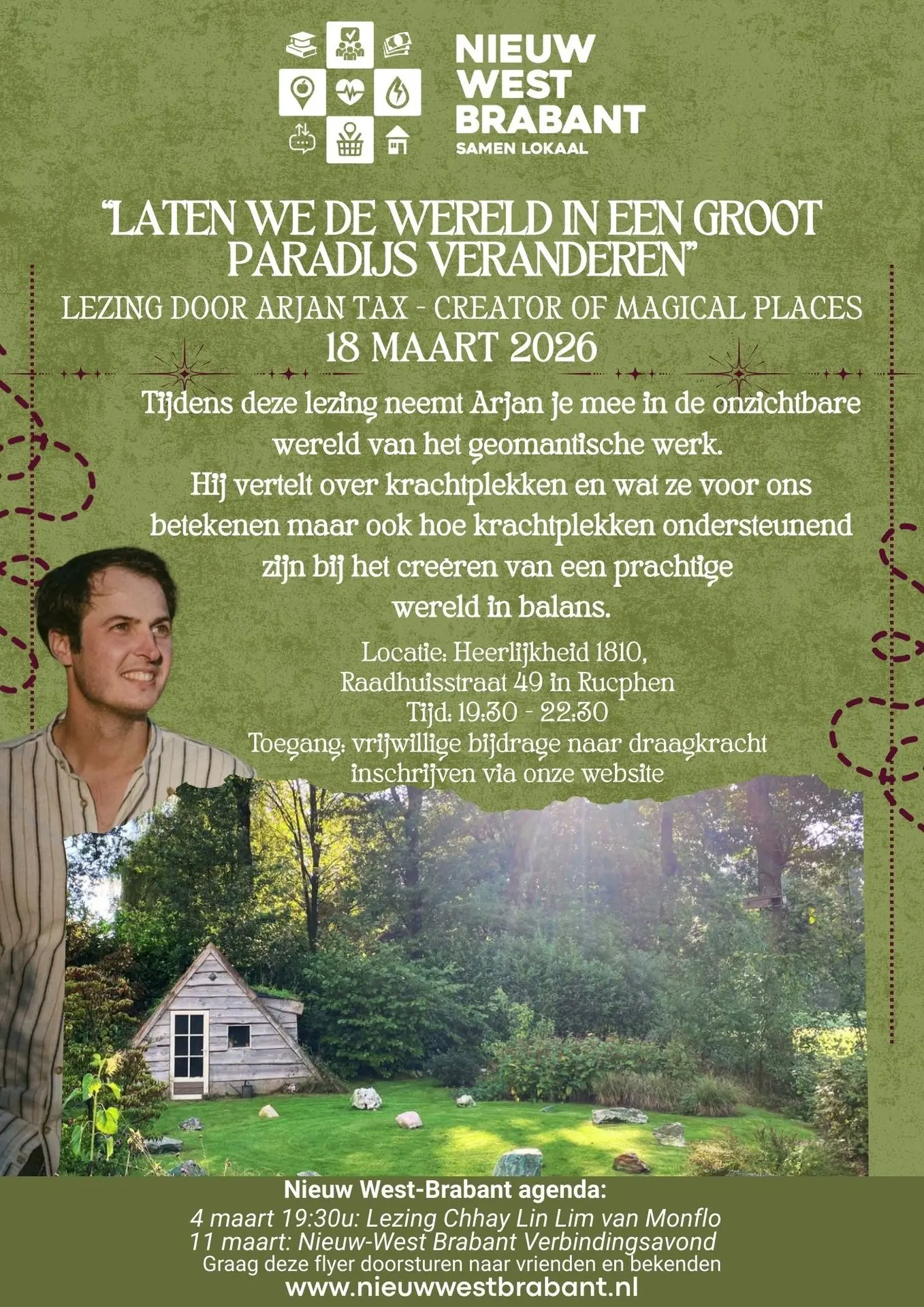 Tijdens deze lezing op 18 maart, neemt Arjan je mee in de onzichtbare wereld van het geomantische werk want de plekken waar we nu leven zitten vol met geschiedenis en trillingen die van invloed zijn op onze gemoedstoestand, waardoor bepaalde patronen zich kunnen blijven herhalen. Daarnaast gaan we het over krachtplekken hebben, wat zijn het, en wat kunnen ze voor ons betekenen. En hoe kunnen krachtplekken ondersteunend zijn bij het creëren van een prachtige wereld in balans.