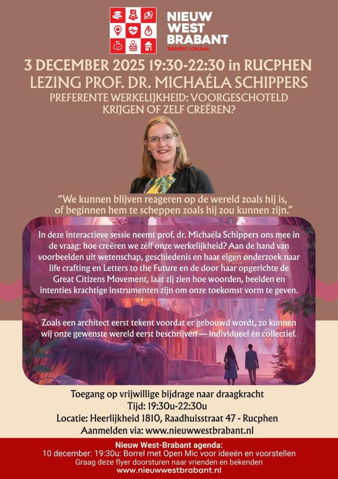 In deze interactieve sessie neemt prof. dr. Michaéla Schippers ons mee in de vraag: hoe creëren we zélf onze werkelijkheid? Aan de hand van voorbeelden uit wetenschap, geschiedenis en haar eigen onderzoek naar life crafting en Letters to the Future en de door haar opgerichte n de Great Citizens Movement, laat zij zien hoe woorden, beelden en intenties krachtige instrumenten zijn om onze toekomst vorm te geven.