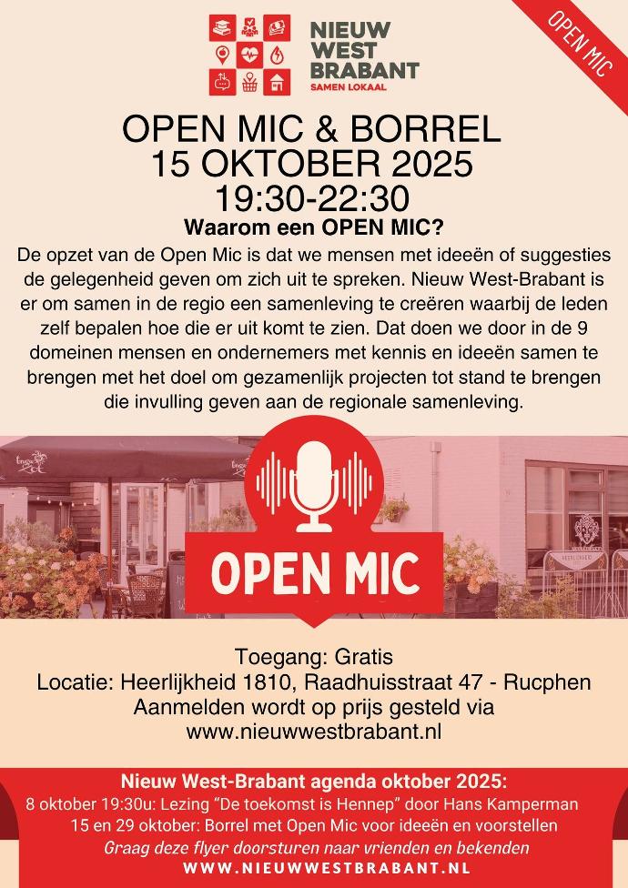 De locatie is open vanaf 19:00 uur en we beginnen om 19.30 uur met de Open-Mic. De opzet van de Open-Mic is dat we mensen met ideeën of suggesties voor Nieuw West-Brabant de gelegenheid geven om zich uit te spreken.
