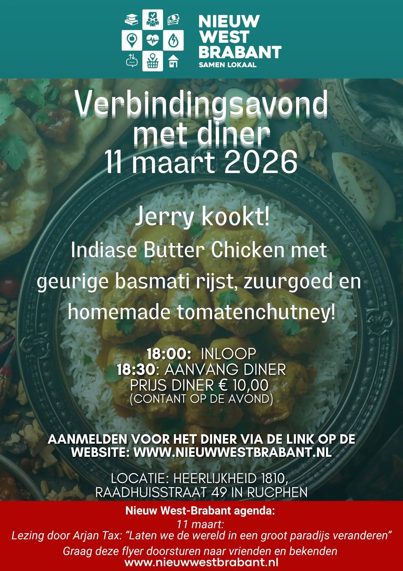 Op 11 maart zal Jerry voor ons koken: Indiase Butter Chicken met geurige basmati rijst, zuurgoed en homemade tomatenchutney voor 10 euro p.p.. De betaling geschied op de avond zelf (contant).