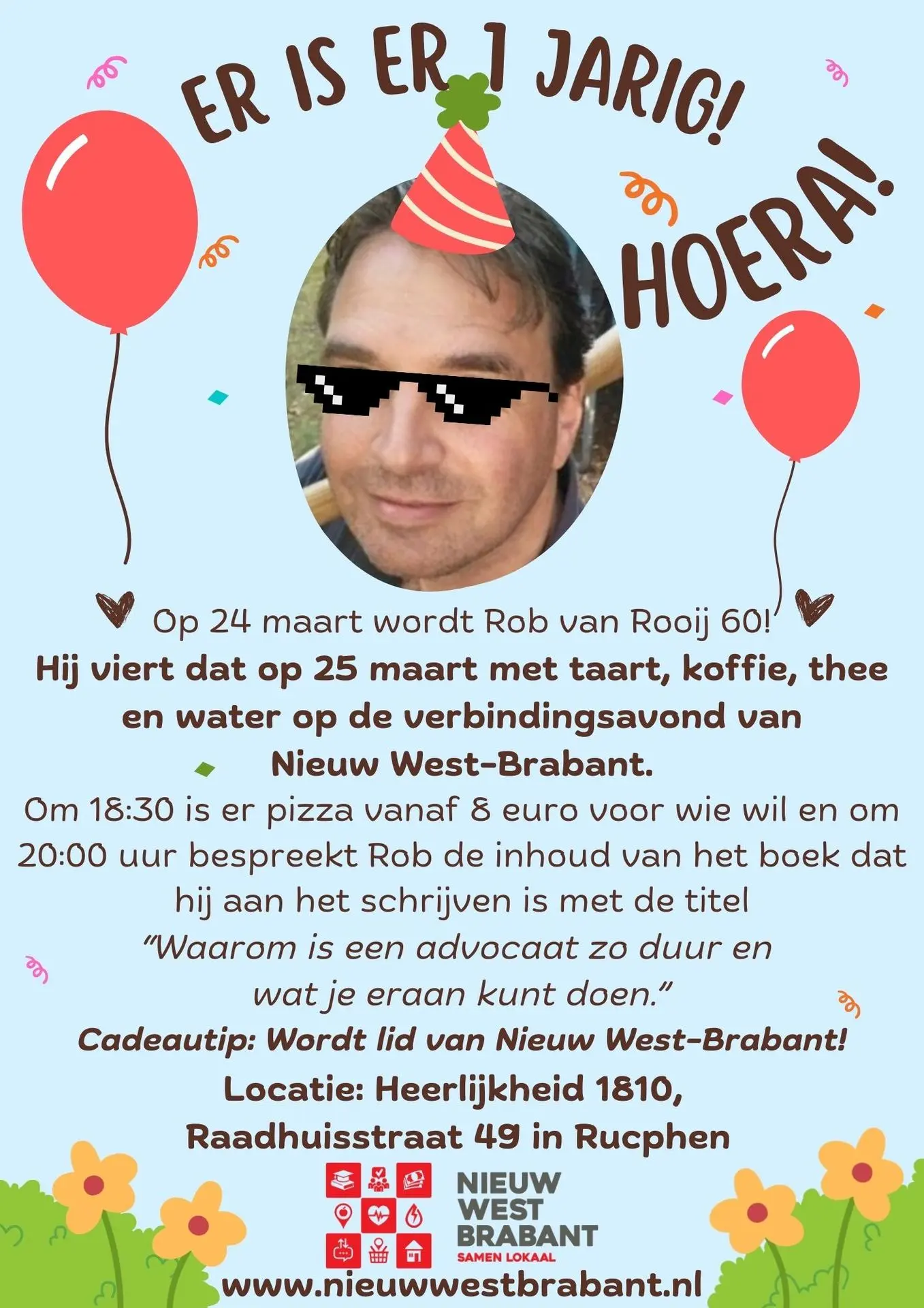 Op 24 maart wordt Rob van Rooij 60. Hij viert dat op 25 maart met taart, koffie, thee en water op de verbindingsavond van Nieuw West-Brabant.